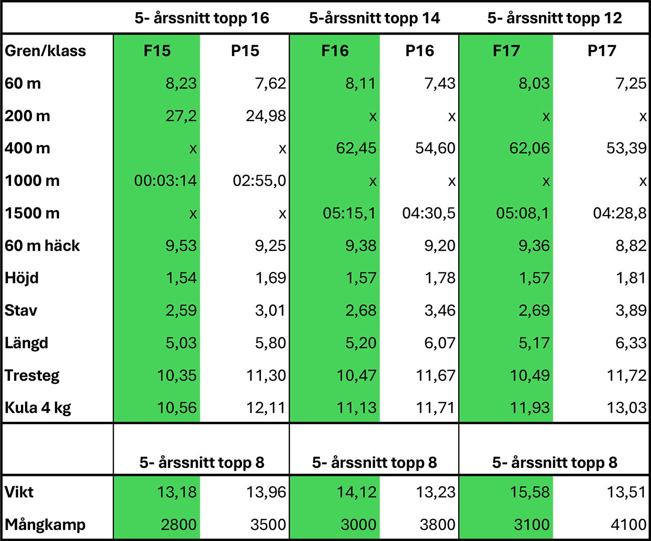 – Normgränser – Se nedan för gällande normgränser. Dessa är statistiskt framtagna och baseras på vad som krävts de senaste åren för att ligga topp 16 för F/P15, topp 14 för F/P16 och topp 12 för F/P 17 (OBS Vikt och Mångkamp gäller Topp 8). Resultat ska vara gjorda under innevarande säsong, gärna vid flera tillfällen.